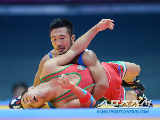 한국레슬링대표팀 류한수가 1일 인천 도원체육관에서 열린 2014인천아시안게임 남자레슬링 그레코로만형 66kg급 4강전에서 우즈베키스탄 타스무라도프와 대결을 펼치고 있다. 인천=최문영 기자 deer@sportschosun.com /2014.10.01/