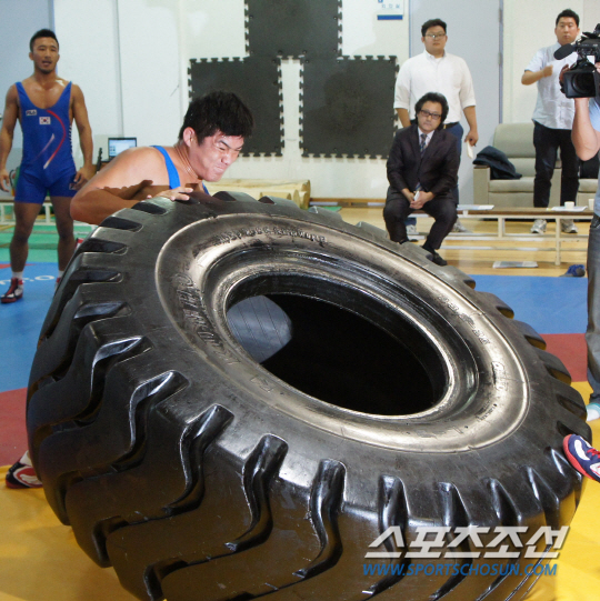 11일 태릉선수촌에서 열린 레슬링대표팀 미디어데이에서 220kg의 타이어를 드는 훈련을 하고 있는 김현우. 태릉=하성룡 기자