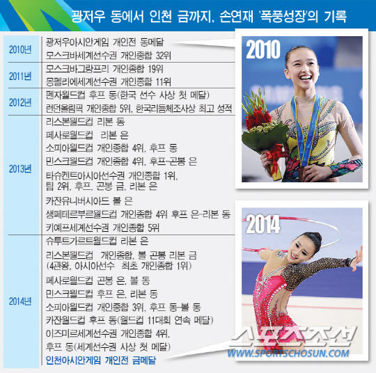 손연재의 길은 대한민국 리듬체조의 역사다. 광저우 동메달 이후 지난 4년간 폭풍성장을 거듭했다. 2010년 모스크바세계선수권 개인종합 32위, 2011년 몽펠리에세계선수권 11위의 2012년 런던올림픽에선 '세계 톱5'에 이름을 올리며 세계 리듬체조계를 놀라게 했다.세계 5위에 만족하지 않았다. 2013년 키에프세계선수권 개인종합 5위에 이어, 2014년 이즈미르세계선수권에선 개인종합 4위, 후프종목 사상 첫 동메달의 쾌거를 썼다. 2014년 리스본월드컵에선 아시아 선수 최초 개인종합 1위에 올랐다. 2013년 리스본월드컵 이후 2014년 카잔월드컵까지 11대회 연속 메달행진을 펼쳤다. 지난 4년간 세계무대에서 확인한 '폭풍성장'은 '안방' 인천에서 눈부신 금메달로 결실을 맺었다. 깜짝응원 온 '절친 선배'박태환이 기특한 동생 손연재를 향해 환한 오빠미소를 지어보였다.