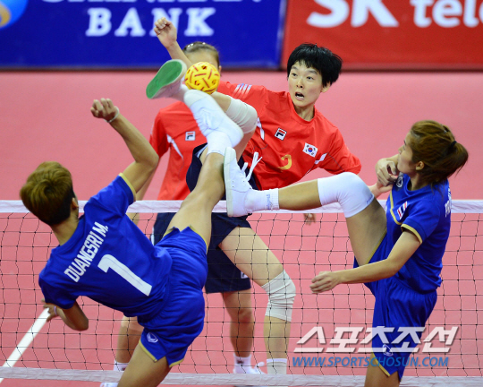 3일 오후 부천경기장에서 2014 인천 아시안게임 세팍타크로 레구 여자 결승 한국과 태국의 경기가 열렸다. 한국 김이슬이 태국 진영을 향해 공격을 시도하고 있다.