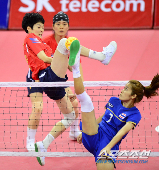 3일 오후 부천경기장에서 2014 인천 아시안게임 세팍타크로 레구 여자 결승 한국과 태국의 경기가 열렸다. 한국 김이슬이 태국의 공격을 막아내고 있다.