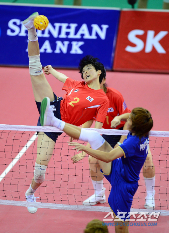 3일 오후 부천경기장에서 2014 인천 아시안게임 세팍타크로 레구 여자 결승 한국과 태국의 경기가 열렸다. 한국 김이슬이 태국 진영을 향해 공격을 시도하고 있다.