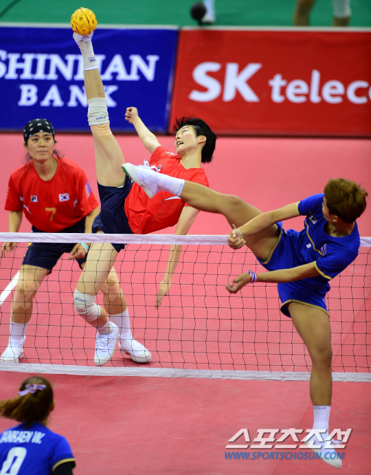 3일 오후 부천경기장에서 2014 인천 아시안게임 세팍타크로 레구 여자 결승 한국과 태국의 경기가 열렸다. 한국 김이슬이 태국 진영을 향해 공격을 시도하고 있다.