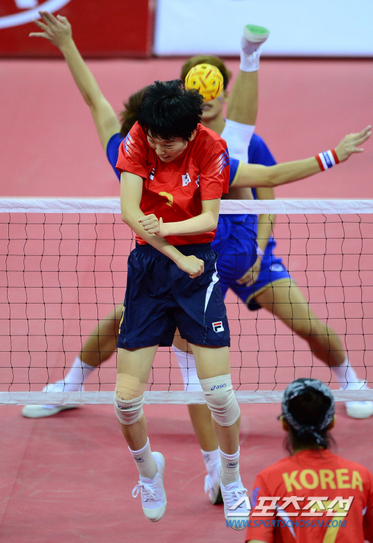 3일 오후 부천경기장에서 2014 인천 아시안게임 세팍타크로 레구 여자 결승 한국과 태국의 경기가 열렸다. 한국 김이슬이 태국의 공격을 몸으로 막고 있다.