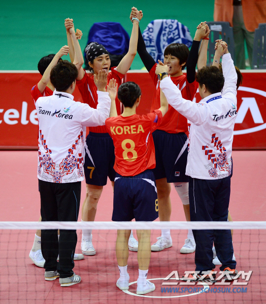 3일 오후 부천경기장에서 2014 인천 아시안게임 세팍타크로 레구 여자 결승 한국과 태국의 경기가 열렸다. 태국에 패배하며 은메달을 차지한 한국 선수들이 서로의 손을 잡고 격려하고 있다.