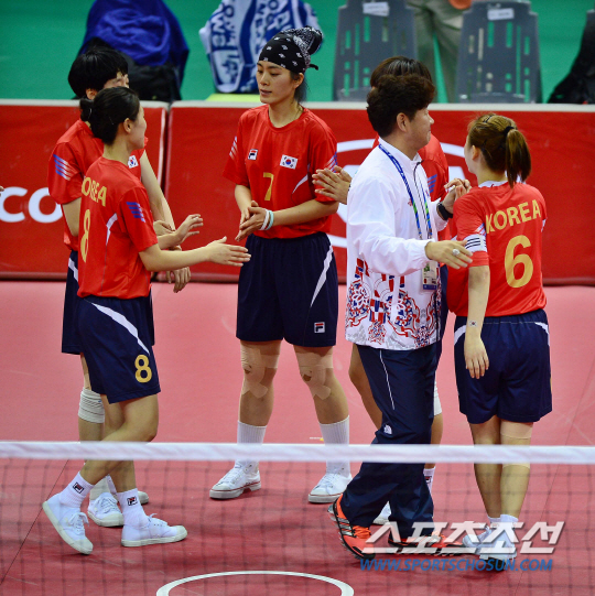 3일 오후 부천경기장에서 2014 인천 아시안게임 세팍타크로 레구 여자 결승 한국과 태국의 경기가 열렸다. 태국에 패배하며 은메달을 차지한 한국 선수들이 서로를 격려하고 있다.