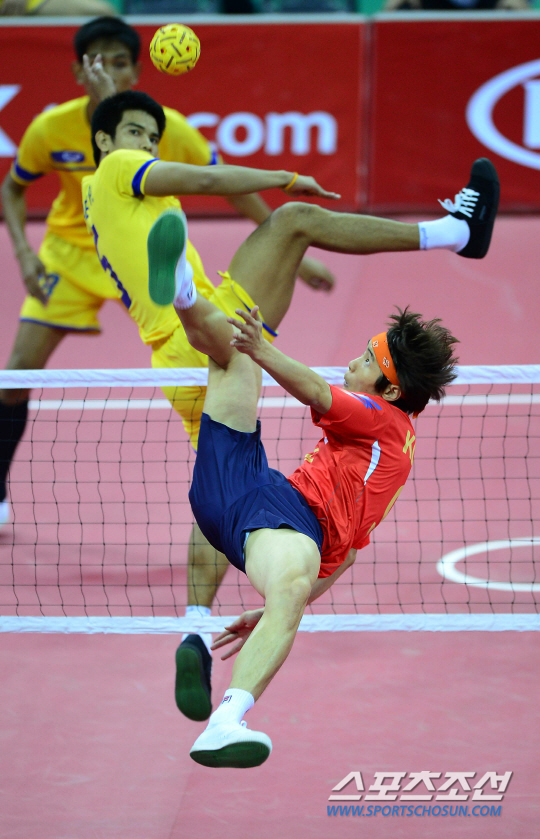 3일 오후 부천경기장에서 2014 인천 아시안게임 세팍타크로 레구 남자 결승 한국과 태국의 경기가 열렸다. 한국 임안수가 태국 진영을 향해 공격을 시도하고 있다.