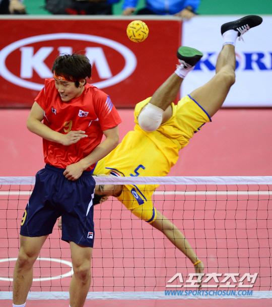 3일 오후 부천경기장에서 2014 인천 아시안게임 세팍타크로 레구 남자 결승 한국과 태국의 경기가 열렸다. 한국 임안수가 태국의 공격을 막아내고 있다.