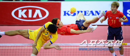 3일 오후 부천경기장에서 2014 인천 아시안게임 세팍타크로 레구 남자 결승 한국과 태국의 경기가 열렸다. 한국 임안수가 태국 진영을 향해 공격을 시도하고 있다.