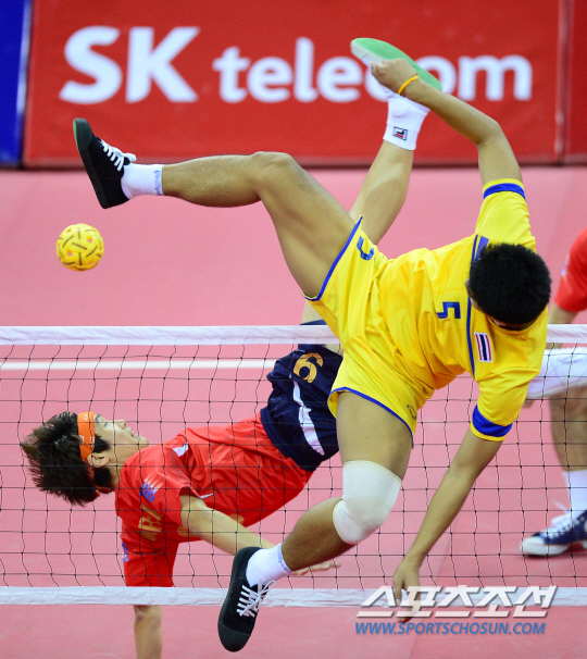 3일 오후 부천경기장에서 2014 인천 아시안게임 세팍타크로 레구 남자 결승 한국과 태국의 경기가 열렸다. 한국 임안수가 태국 진영을 향해 공격을 시도하고 있다.