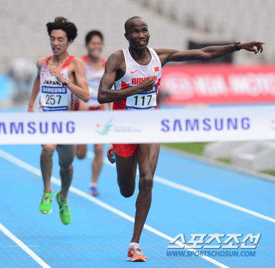 3일 인천 송도 센트럴파크 앞을 출발해 인천아시아드주경기장으로 들어오는 코스에서 펼쳐진 인천아시안게임 남자 마라톤에서 바레인 마흐부부가 1위로 골인하며 환호하고 있다. 그의 기록은 2시간12분38초.