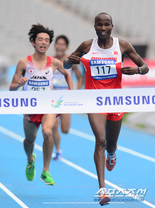 3일 인천 송도 센트럴파크 앞을 출발해 인천아시아드주경기장으로 들어오는 코스에서 펼쳐진 인천아시안게임 남자 마라톤에서 바레인 마흐부부가 1위로 골인하며 환호하고 있다. 그의 기록은 2시간12분38초.