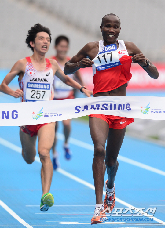 3일 인천 송도 센트럴파크 앞을 출발해 인천아시아드주경기장으로 들어오는 코스에서 펼쳐진 인천아시안게임 남자 마라톤에서 바레인 마흐부부가 1위로 골인하며 환호하고 있다. 그의 기록은 2시간12분38초. 2위는 일본의 마쓰무라 코헤이(2시간12분39초), 3위 카와우치 유키(2시간12분42초)