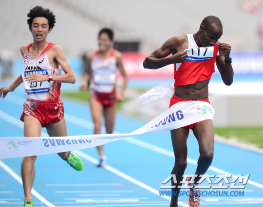 3일 인천 송도 센트럴파크 앞을 출발해 인천아시아드주경기장으로 들어오는 코스에서 펼쳐진 인천아시안게임 남자 마라톤에서 바레인 마흐부부가 1위로 골인하며 환호하고 있다. 그의 기록은 2시간12분38초. 2위는 일본의 마쓰무라 코헤이(2시간12분39초), 3위 카와우치 유키(2시간12분42초)