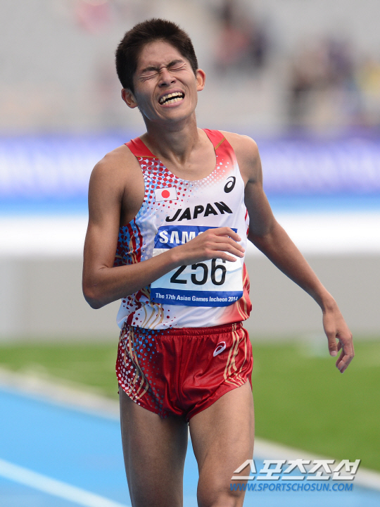 3일 인천 송도 센트럴파크 앞을 출발해 인천아시아드주경기장으로 들어오는 코스에서 펼쳐진 인천아시안게임 남자 마라톤에서 일본 카와우치 유키가 3위로 골인하며 고통스러워하고 있다. 1위는 바레인 마흐부부(2시간12분38초). 2위는 일본의 마추무라 코헤이(2시간12분39초), 3위 카와우치 유키(2시간12분42초)
