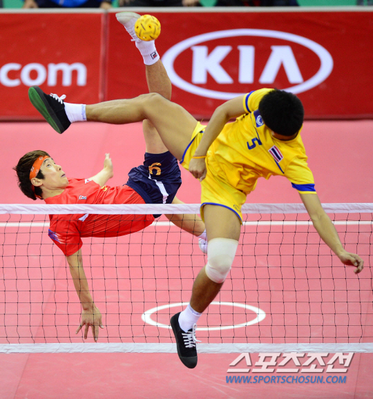 3일 오후 부천경기장에서 2014 인천 아시안게임 세팍타크로 레구 남자 결승 한국과 태국의 경기가 열렸다. 한국 임안수가 태국 진영을 향해 공격을 시도하고 있다.