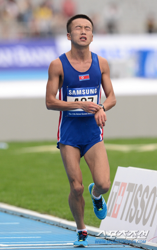 3일 인천 송도 센트럴파크 앞을 출발해 인천아시아드주경기장으로 들어오는 코스에서 펼쳐진 인천아시안게임 남자 마라톤에서 북한 박철이 5위(2시간14분34초)로 골인하며 고통스러워하고 있다. 박철은 선두그룹과 레이스 막판까지 경쟁하다 넘어지는 사고로 뒤쳐지며 5위에 그쳤다.