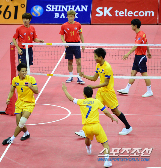 3일 오후 부천경기장에서 2014 인천 아시안게임 세팍타크로 레구 남자 결승 한국과 태국의 경기가 열렸다. 태국에 패배하며 금메달 획득에 실패한 선수들이 아쉬워하고 있다.