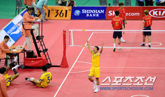 3일 오후 부천경기장에서 2014 인천 아시안게임 세팍타크로 레구 남자 결승 한국과 태국의 경기가 열렸다. 태국에 패배하며 금메달 획득에 실패한 선수들이 아쉬워하고 있다.