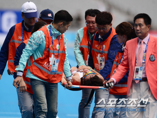 3일 인천 송도 센트럴파크 앞을 출발해 인천아시아드주경기장으로 들어오는 코스에서 펼쳐진 인천아시안게임 남자 마라톤에서 한국 노시완이 13위로(2시간31분29초)로 골인한 후 탈진해 들것에 실려나가고 있다. 1위는 바레인 마흐부부(2시간12분38초). 2위는 일본의 마추무라 코헤이(2시간12분39초), 3위 카와우치 유키(2시간12분42초)