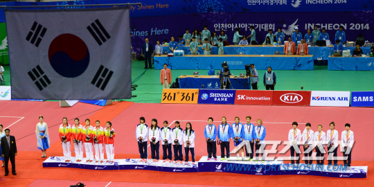 3일 오후 부천실내체육관에서 2014 인천 아시안게임 세팍타크로 레구 여자 결승 시상식이 열렸다. 주최측의 실수로 은메달을 차지한 한국팀이 동메달 자리에 서있다.
