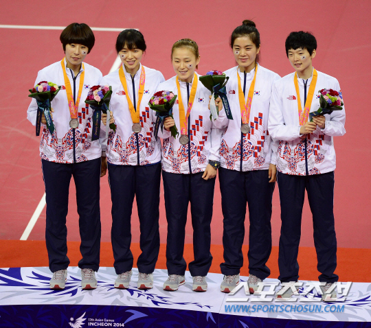 3일 오후 부천실내체육관에서 2014 인천 아시안게임 세팍타크로 레구 여자 결승 시상식이 열렸다. 은메달을 차지한 한국 선수들이 환호하고 있다.