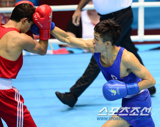 인천 아시안게임 남자복싱 49KG급 결승전이 3일 인천 선학체육관에서 열렸다. 한국 신종훈이 카자흐스탄 쟈키포프 선수와 대결에서 승리하며 금메달을 획득했다. 신종훈이 공격을 시도하고 있다.
