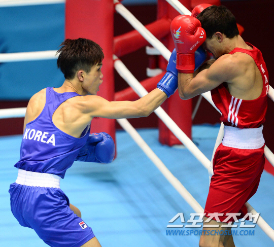 인천 아시안게임 남자복싱 49KG급 결승전이 3일 인천 선학체육관에서 열렸다. 한국 신종훈이 카자흐스탄 쟈키포프 선수와 대결에서 승리하며 금메달을 획득했다. 신종훈이 공격을 시도하고 있다.