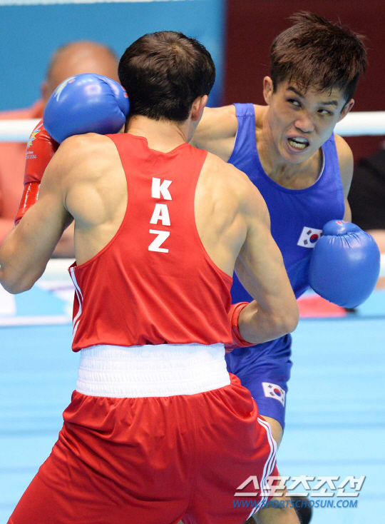 인천 아시안게임 남자복싱 49KG급 결승전이 3일 인천 선학체육관에서 열렸다. 한국 신종훈이 카자흐스탄 쟈키포프 선수와 대결에서 승리하며 금메달을 획득했다. 신종훈이 공격을 시도하고 있다.