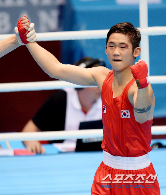 인천 아시안게임 남자복싱 56KG급 결승전이 3일 인천 선학체육관에서 열렸다. 한국 함상명이 중국 장지아웨이를 판정승으로 꺾고 금메달을 차지했다. 함상명이 환호하고 있다.