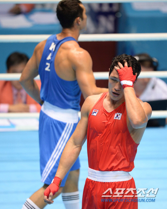 인천 아시안게임 남자복싱 81KG급 결승전이 3일 인천 선학체육관에서 열렸다. 한국 김형규가 카자흐스탄 니야짐베토프와의 대결에서 아깝게 판정패하자 아쉬워하고 있다.