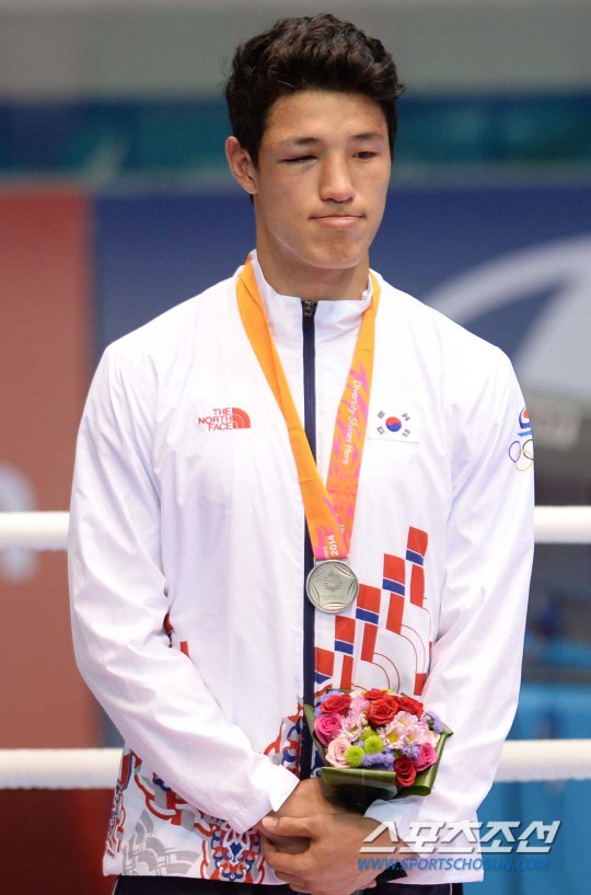인천 아시안게임 남자복싱 81KG급 결승전이 3일 인천 선학체육관에서 열렸다. 한국 김형규가 카자흐스탄 니야짐베토프와의 대결에서 아깝게 판정패하며 은메달을 획득했다. 시상식에서 은메달을 목에 건 김형규가 포즈를 취하고 있다.