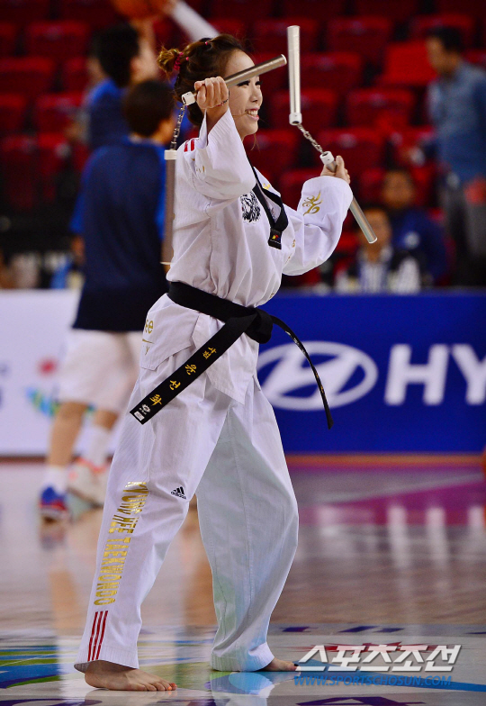 3일 오후 인천 삼산월드체육관에서 2014 인천 아시안게임 농구 남자 결승 한국과 이란의 경기가 열렸다. 치어리더들이 태권도 응원을 벌이고 있다.