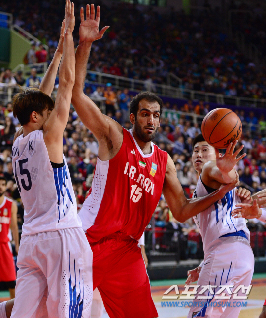 3일 오후 인천 삼산월드체육관에서 2014 인천 아시안게임 농구 남자 결승 한국과 이란의 경기가 열렸다. 이란 하다디가 김종규(왼쪽)과 오세근의 수비에 막혀 볼을 놓치고 있다.