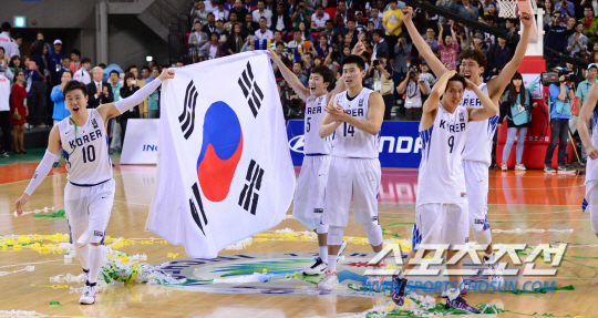 3일 오후 인천 삼산월드체육관에서 2014 인천 아시안게임 농구 남자 결승 한국과 이란의 경기가 열렸다. 이란에 승리하며 금메달을 획득한 한국 선수들이 기뻐하고 있다.