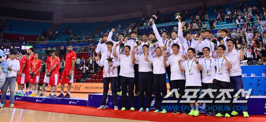 3일 오후 인천 삼산월드체육관에서 2014 인천 아시안게임 농구 남자 결승 한국과 이란의 경기가 열렸다. 이란에 승리하며 금메달을 획득한 한국 선수들이 기뻐하고 있다. 왼쪽은 은메달을 차지한 이란 선수단