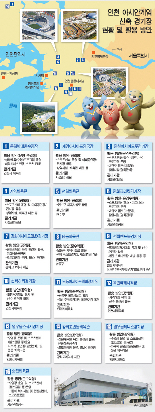 가장 많은 예산이 투입된 아시아드주경기장 활용이 향후 가장 큰 과제다. 일단 서울월드컵경기장을 롤모델 삼고 있다. 주경기장 전체좌석 6만2818석중 가변석 3만여석을 철거한다. 이 공간에 패션몰, 아울렛 등 대규모 복합상가를 유치하고 마트, 컨벤션센터, 예식장, 영화관 등 상업, 편의시설을 유치할 계획이다. 인천시시설관리공단이 인천아시아드주경기장을 비롯해, 송림체육관, 계양체육관 등 5개소를 관리한다. 송림체육관은 수영장 운영, 스포츠센터 운영, 어린이 복지시설 및 컨벤션센터 유치를 추진한다. 계양체육관은 스포츠센터 및 야외공연장 전시장으로 활용할 계획이다.