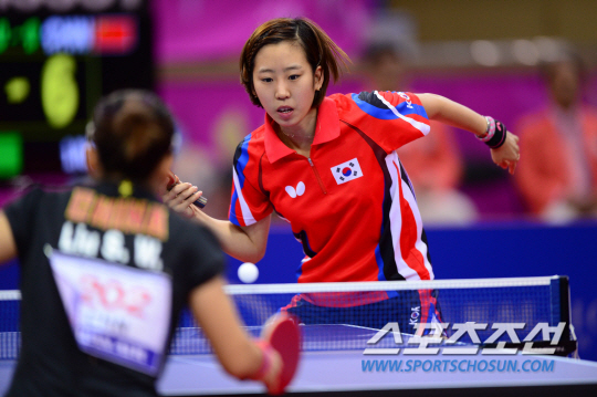 4일 오후 경기도 수원체육관에서 2014 인천 아시안게임 탁구 여자 단식 4강전이 열렸다. 한국 양하은이 중국 리우 쉐엔을 상대로 공격을 시도하고 있다.