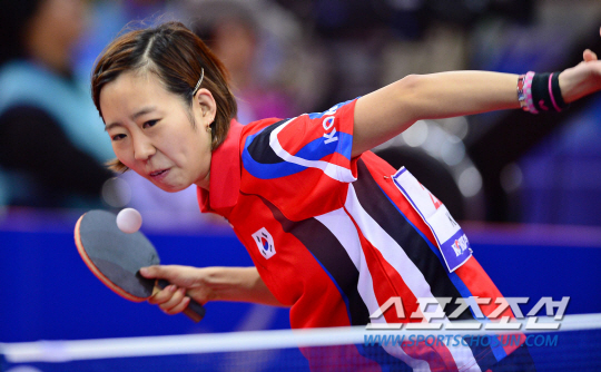 4일 오후 경기도 수원체육관에서 2014 인천 아시안게임 탁구 여자 단식 4강전이 열렸다. 한국 양하은이 중국 리우 쉐엔을 상대로 서브 공격을 시도하고 있다.