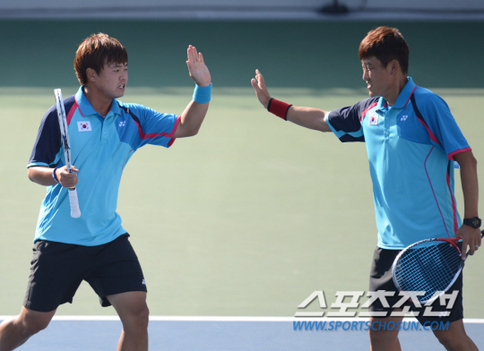 인천 아시안게임 정구 남자 단체전 한국과 중국의 준결승전이 4일 인천 열우물테니스경기장에서 열렸다. 한국이 2-0(5-1,4-0으로 승리하며 결승에 진출했다. 이상권(왼쪽)과 박규철이 1매치 복식경기에서 승리한 후 환호하고 있다.