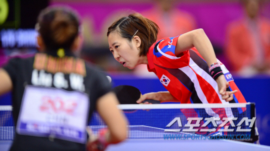 4일 오후 경기도 수원체육관에서 2014 인천 아시안게임 탁구 여자 단식 4강전이 열렸다. 한국 양하은이 중국 리우 쉐엔을 상대로 서브 공격을 시도하고 있다.