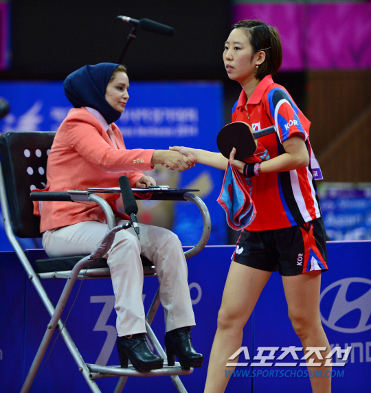 4일 오후 경기도 수원체육관에서 2014 인천 아시안게임 탁구 여자 단식 4강전이 열렸다. 중국 리우 쉐엔에 패배하며 결승행이 좌절된 한국 양하은이 경기장을 나서고 있다.