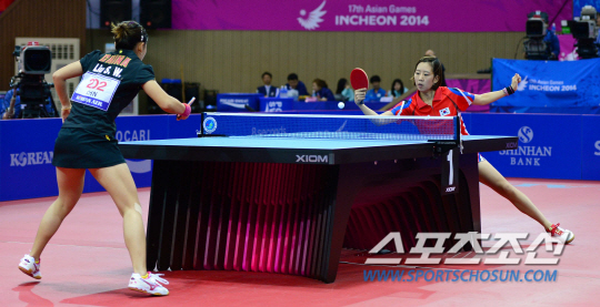 4일 오후 경기도 수원체육관에서 2014 인천 아시안게임 탁구 여자 단식 4강전이 열렸다. 한국 양하은이 중국 리우 쉐엔을 상대로 공격을 시도하고 있다.