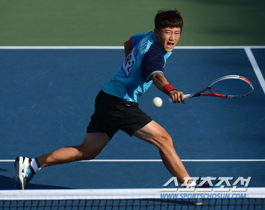 인천 아시안게임 정구 남자 단체전 한국과 중국의 준결승전이 4일 인천 열우물테니스경기장에서 열렸다. 한국이 2-0(5-1,4-0)으로 승리하며 결승에 진출했다. 박규철이 1매치 복식경기에서 공을 넘기고 있다.