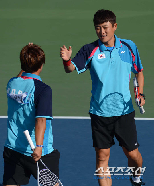 인천 아시안게임 정구 남자 단체전 한국과 중국의 준결승전이 4일 인천 열우물테니스경기장에서 열렸다. 한국이 2-0(5-1,4-0)으로 승리하며 결승에 진출했다. 박규철과 이상권(왼쪽)과 박규철이 1매치 복식경기에서 승리한 후 환호하고 있다.