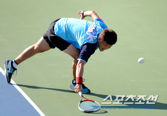 인천 아시안게임 정구 남자 단체전 한국과 중국의 준결승전이 4일 인천 열우물테니스경기장에서 열렸다. 한국이 2-0(5-1,4-0)으로 승리하며 결승에 진출했다. 박규철이 1매치 복식경기를 벌이고 있다.