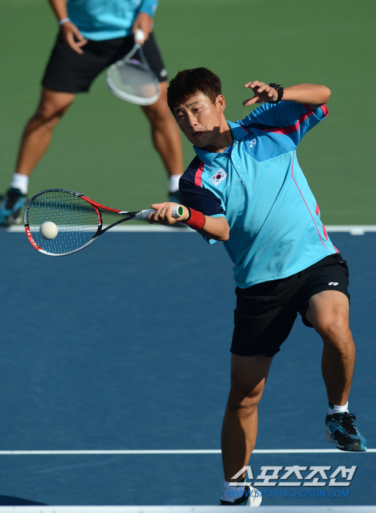 인천 아시안게임 정구 남자 단체전 한국과 중국의 준결승전이 4일 인천 열우물테니스경기장에서 열렸다. 한국이 2-0(5-1,4-0)으로 승리하며 결승에 진출했다. 박규철이 1매치 복식경기를 벌이고 있다.