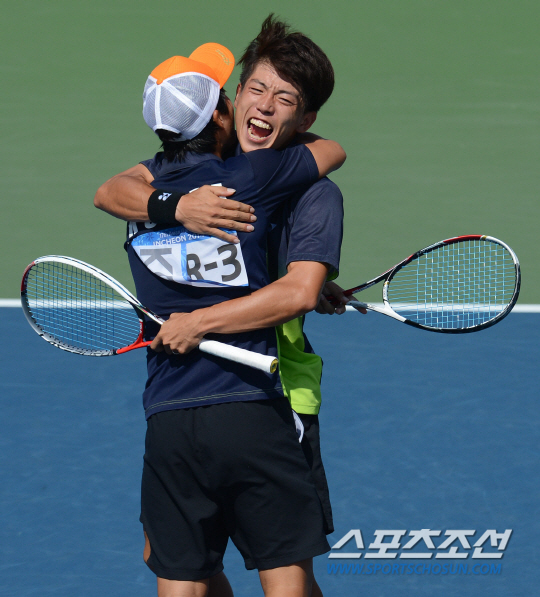 인천 아시안게임 정구 남자 단체전 한국과 일본의 결승전이 4일 인천 열우물테니스경기장에서 열렸다. 한국의 김동훈(앞)-김범준 조가 1매치 복식경기에서 일본 시노하라-고바야시 조를 5-3으로 꺾으며 환호하고 있다.