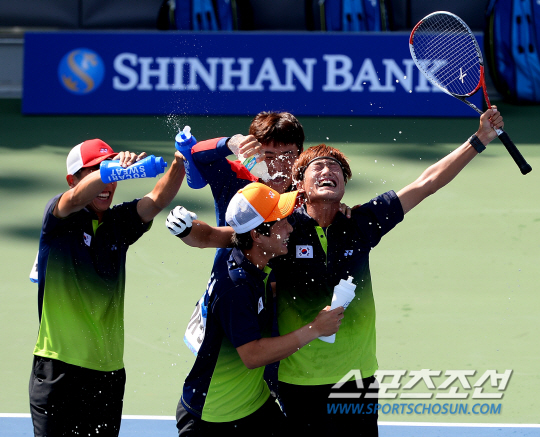 인천 아시안게임 정구 남자 단체전 한국과 일본의 결승전이 4일 인천 열우물테니스경기장에서 열렸다. 한국 김형준이 2매치 단식에서 4-2로 승리를 거두며 매치 스코어 2-0으로 단체전 우승을 차지한 선수들이 환호하고 있다.