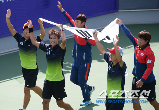 인천 아시안게임 정구 남자 단체전 한국과 일본의 결승전이 4일 인천 열우물테니스경기장에서 열렸다. 한국 김형준이 2매치 단식에서 4-2로 승리를 거두며 매치 스코어 2-0으로 단체전 우승을 차지한 선수들이 환호하고 있다.